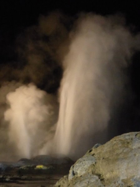It usually performs hourly, but of course the exact timing cannot be predicted. We are very fortunate when just ten minutes before we are due to return to the front entrance, the geyser decides to put on a spectacular show. Plumes thirty meters high shoot straight up into the star-spattered sky, the heat steaming glasses and cameras.
