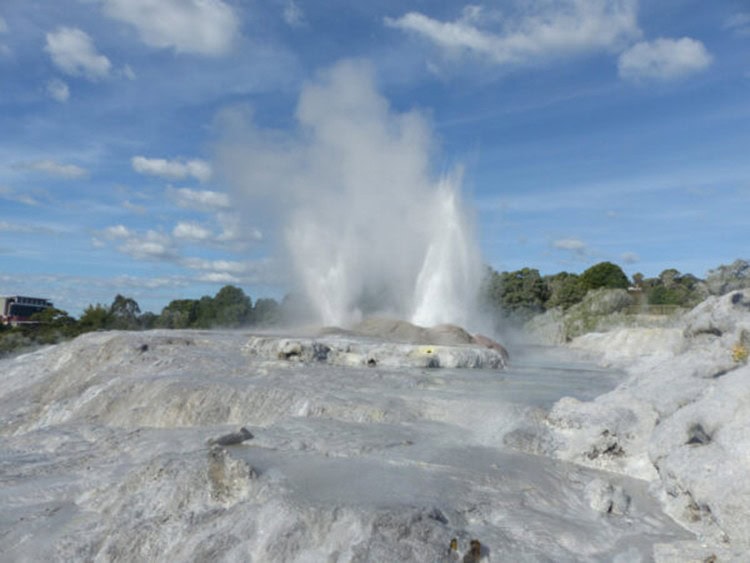 A Māori guide takes us around the grounds with a group of about forty people. We are lucky to arrive at the main geyser just as it blows its top—an impressive site indeed.